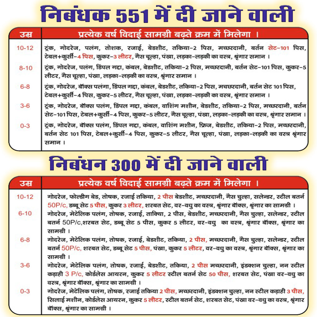 कन्या विवाह एवं विकास समाज के द्वारा कन्याओं को दिए जाने अनुदान (दहेज)।